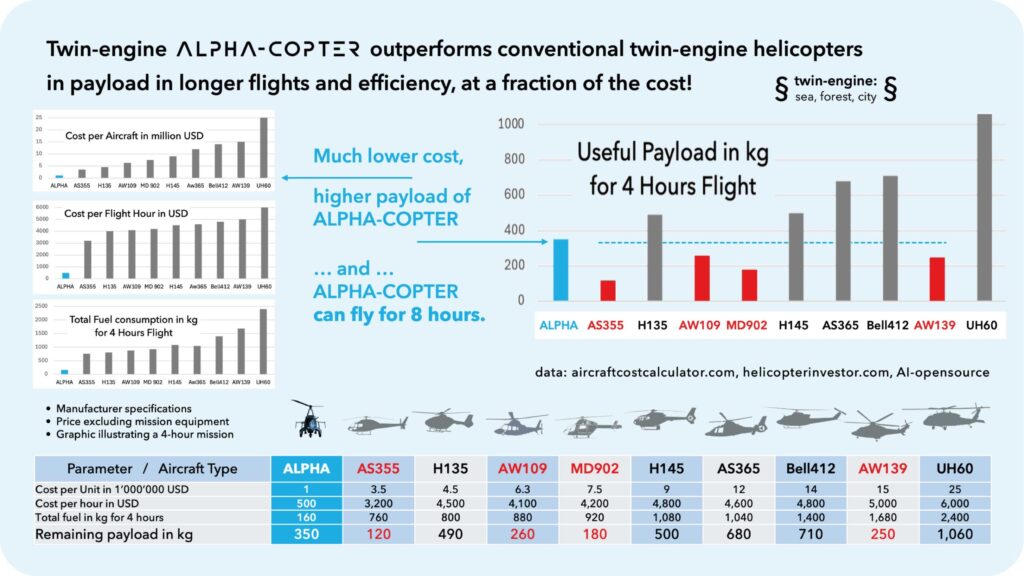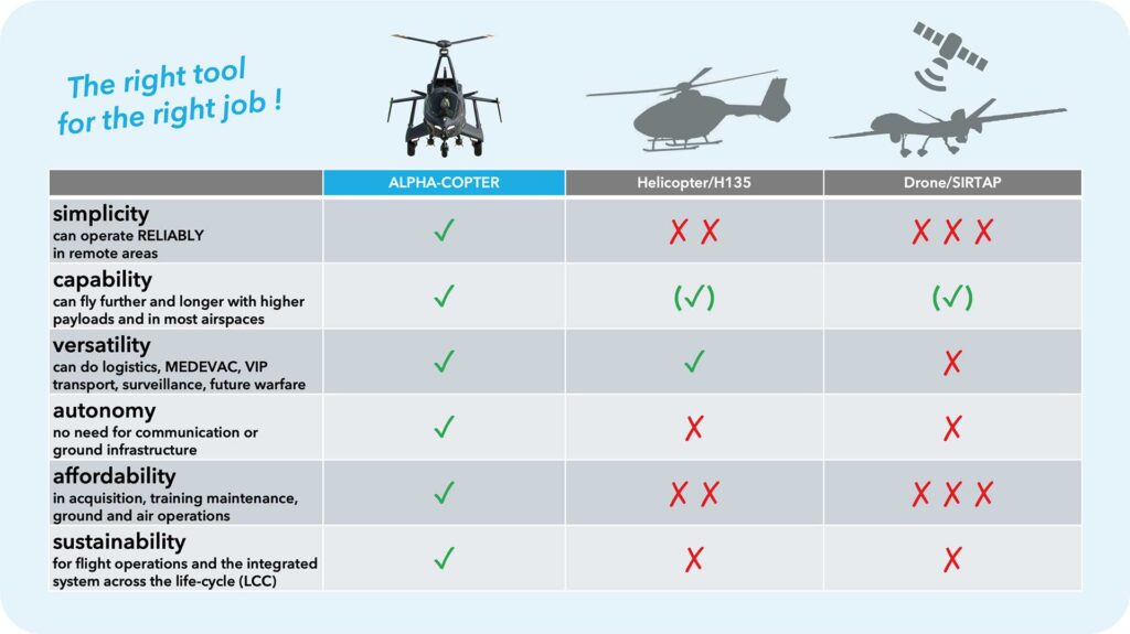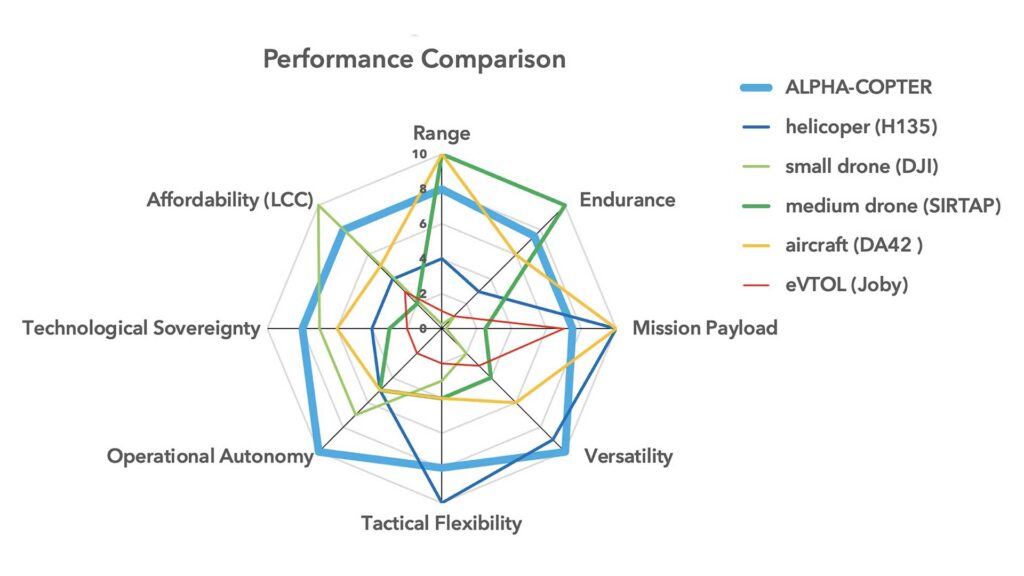 | ALPHA-COPTER (twin-engine) | Helicopter (e.g. H135) | Drone (e.g. MALE/SIRTAP) |