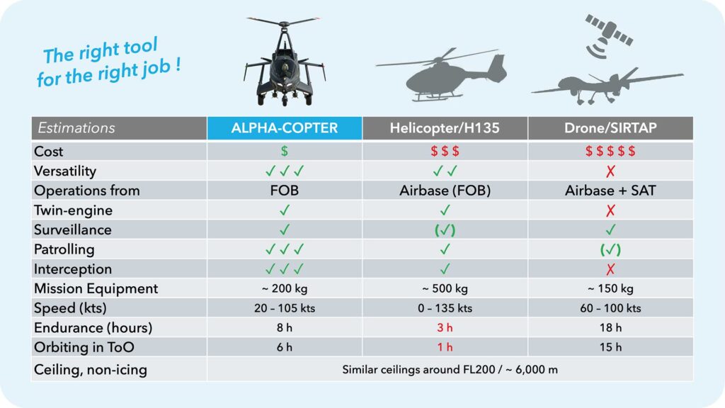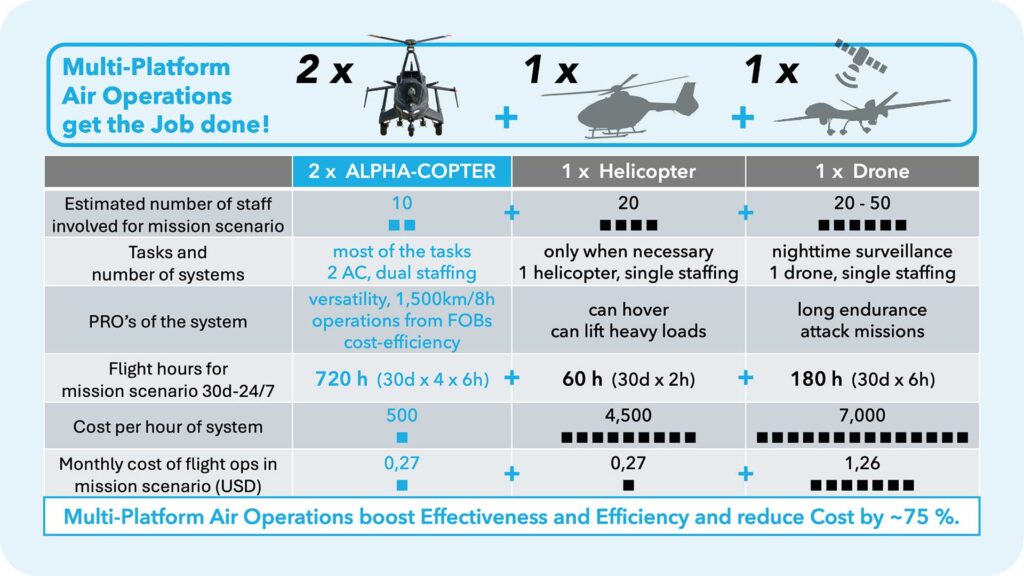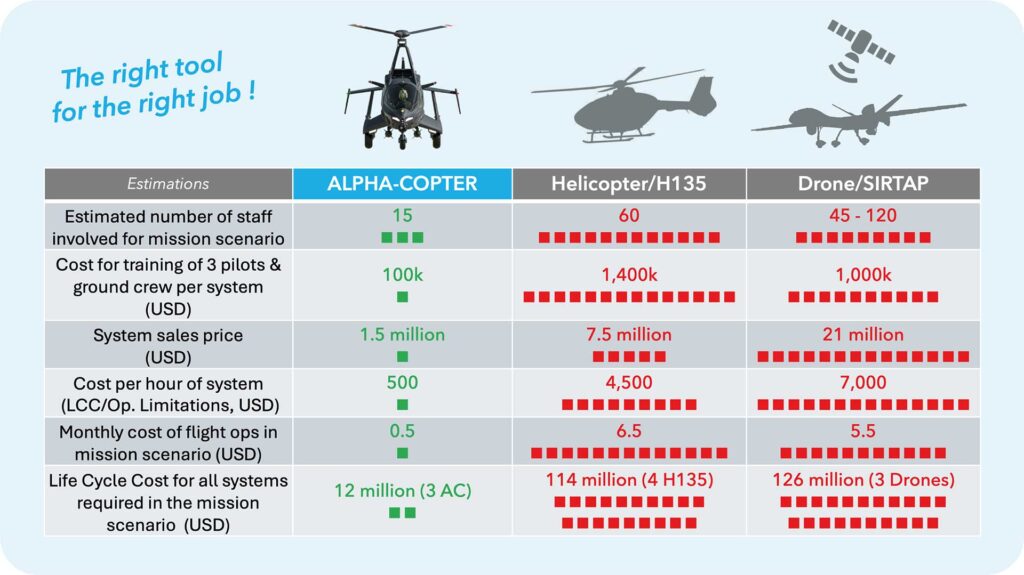 The three distinct systems are designed with different strengths. ALPHA-COPTER stands out for its versatility and cost-efficiency, while helicopters excel in hovering capabilities, and certain drones provide extended flight durations. It's important to note that international rules of engagement typically restrict drones from conducting interception missions; however, they are often very effective in surveillance and attack operations.